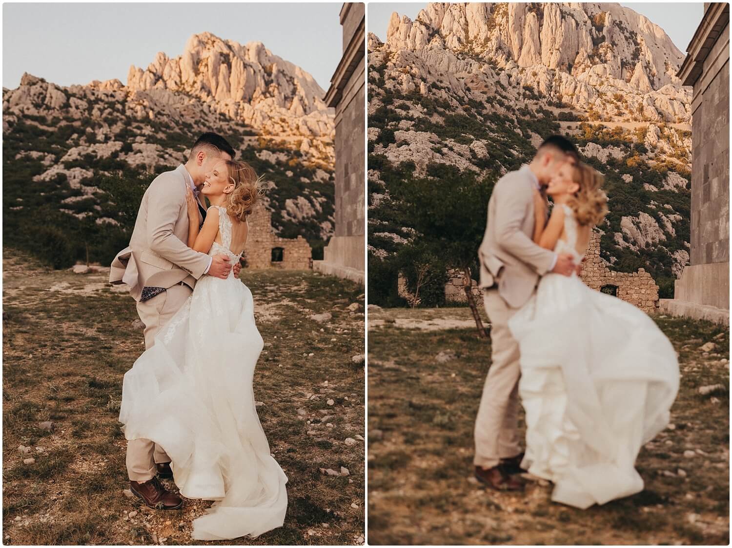 Vjetar je tog dana bio njihov tihi saveznik. Prolazio im je kroz kosu, pomicao veo, nosio smijeh niz padine. Sunce se polako spuštalo iza stijena, a zlatno svjetlo obavilo je trenutak mekoćom. Nije bilo publike. Samo pogledi koji traju sekundu duže. Ruke koje se ne puštaju. Dah prije “zauvijek”.